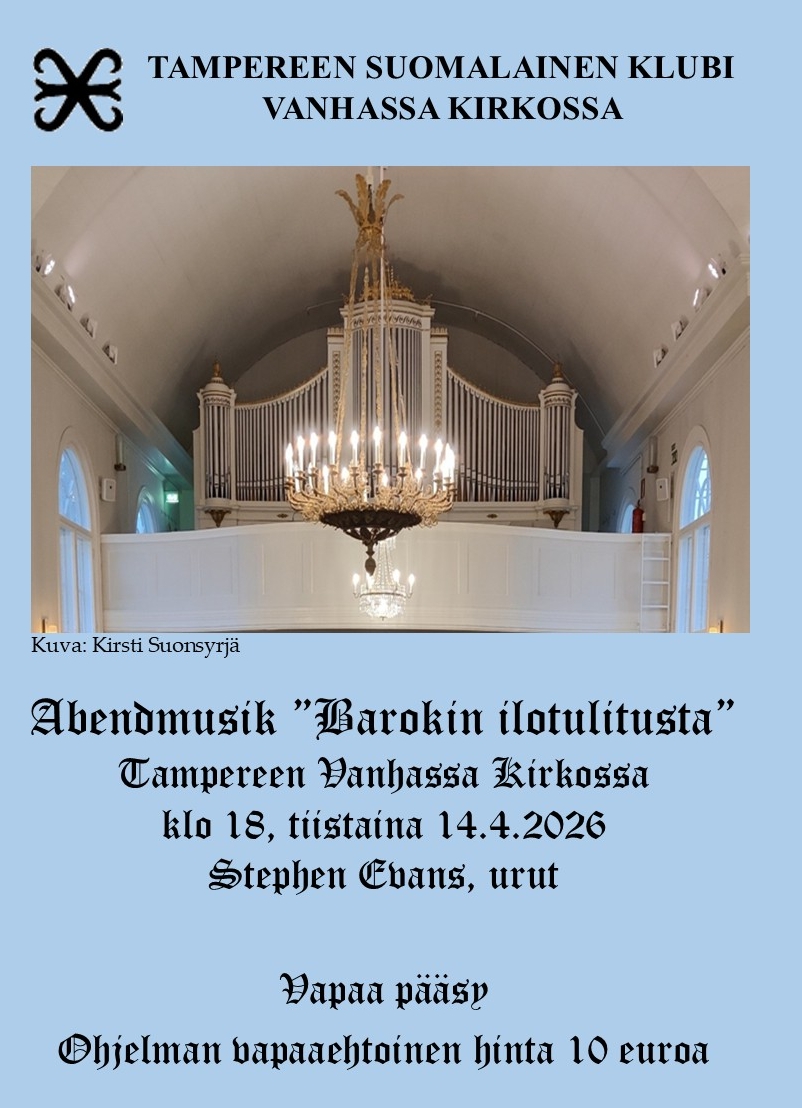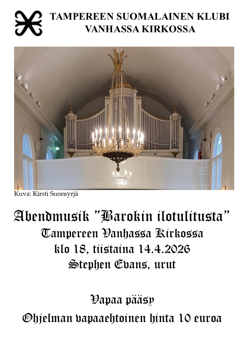 Tervetuloa Suomalaisen Klubin jäsenet ja kaikkikin tamperelaiset Vanhaan kirkkoon tiistaina 14.4.2026 klo 18.00 nauttimaan Stephen Evansin barokin urkumusiikista. Stephen soittaa Johann Sebastian Bachin (1685 Eisenach-1750 Leipzig) sekä hänen opettajansa Dietrich Buxtehuden (1637 Helsingborg-1707 Lyypekki) huikaisevia urkuteoksia. Konsertin kesto n. 60 min. Vapaaehtoinen ohjelman hinta 10 €, ohjelmia ovelta. Konsertti on avoin kaikille tamperelaisille. Mahdollinen konsertin ylijäämä lahjoitetaan Vanhan kirkon diakoniatyöhön. Konsertin järjestävät Tampereen Suomalainen Klubi ja Tuomiokirkkoseurakunta.